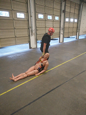 This event uses a weighted mannequin equipped with a harness with shoulder handles.